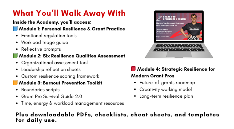 The Resilience Grant Pro Academy is a transformational 4-part learning experience designed to help Grant Writers, Managers, Accountants, Development Pros, and Program Staff strengthen their resilience, protect their creativity, and work with clarity — even in high-pressure environments. This Academy combines: ✔️ Self-paced training ✔️ Downloadable toolkits ✔️ Assessment guides ✔️ Reflection worksheets ✔️ Grant Pro survival resources ✔️ Professional resilience practices ✔️ Access to the Resilience Community